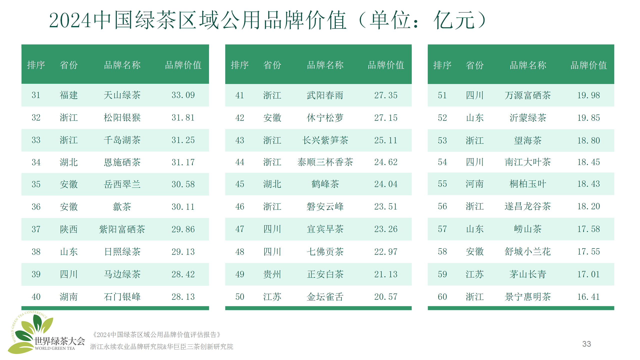 根據(jù)自主研發(fā)的品牌價(jià)值評(píng)估模型,我們得出了《2024中國綠茶區(qū)域公用品牌價(jià)值評(píng)估報(bào)告》,單位是億元。