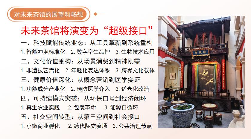 茶館還可以與文創(chuàng)、藝術(shù)展、私房菜、療愈、養(yǎng)生等內(nèi)容融合發(fā)展。未來,茶館將演變?yōu)槌壗涌?,表現(xiàn)在科技賦能傳統(tǒng)業(yè)態(tài)、文化價值重構(gòu)、健康價值深化、可持續(xù)模式突破、社交空間轉(zhuǎn)型。