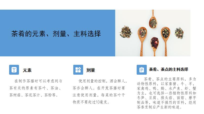 茶葉中含有蛋白質(zhì)、氨基酸、生物堿、茶多酚、礦物質(zhì)等元素,具有抗氧化、抑菌消炎、調(diào)節(jié)血脂與血糖等功能,富有色、香、味三大特長,能飲用,能調(diào)和滋味,又具有藥理成分。在制作茶肴時,需要考慮與茶有關(guān)的元素、茶葉的劑量,以及主料的選擇;烹制菜肴時也需要選擇合適的方法。在茶點(diǎn)制作上,常見的有將茶汁、茶粉融入中西面點(diǎn),以及如中式茶香綠豆糕、西式抹茶奶油蛋糕、茶香曲奇等創(chuàng)新茶點(diǎn)。