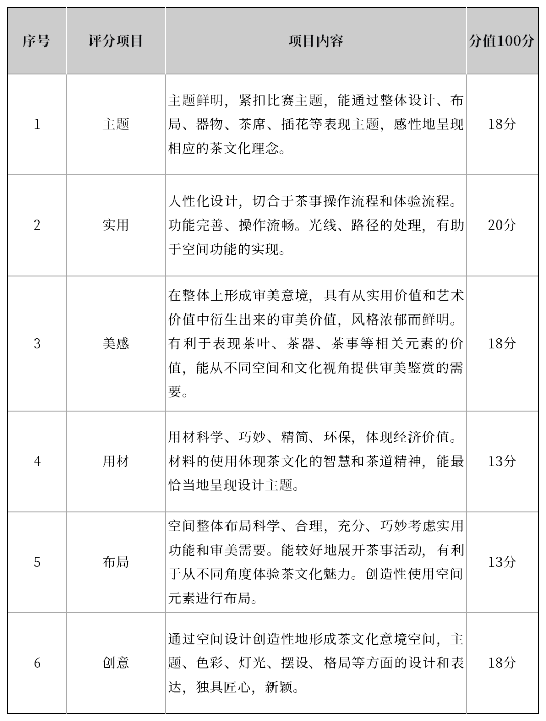 2025“茶與筑”茶空間設(shè)計(jì)大賽作品評(píng)選以評(píng)委線上打分評(píng)選形式展開(kāi),評(píng)委線上對(duì)每個(gè)作品進(jìn)行評(píng)分,由組委會(huì)計(jì)算每個(gè)作品最終得分